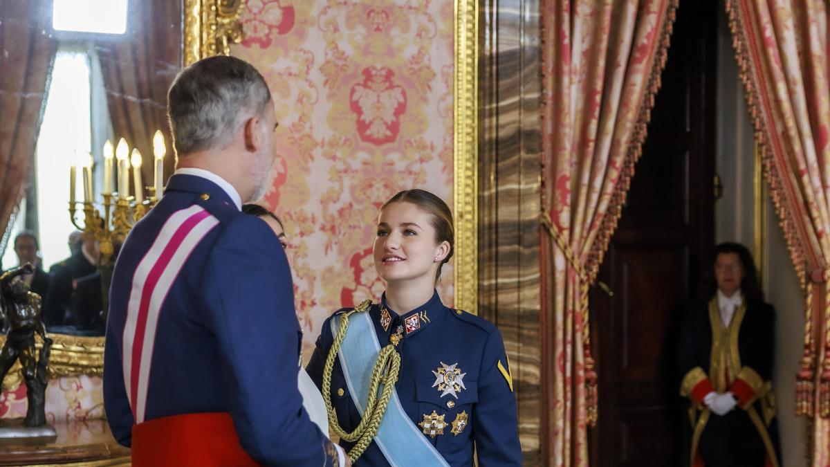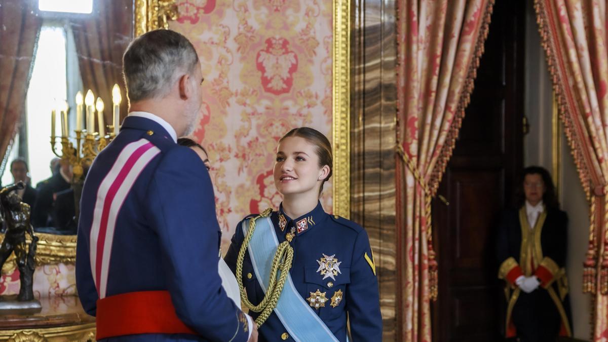 Leonor, junto a los Reyes, llegó poco antes de las 12 del mediodía a la plaza de la Armería y, tras la revista a las tropas por parte del Rey, tuvo lugar la ceremonia en el Palacio Real . En la sala Gasparini, los Reyes y la heredera saludaron a los presentes, y, en el salón del Trono, tras la entrega de condecoraciones a los miembros de las Fuerzas Armadas y la Guardia Civil distinguidos por sus méritos, se escucharon los discurso de la ministra de Defensa, Margarita Robles, y del Rey.