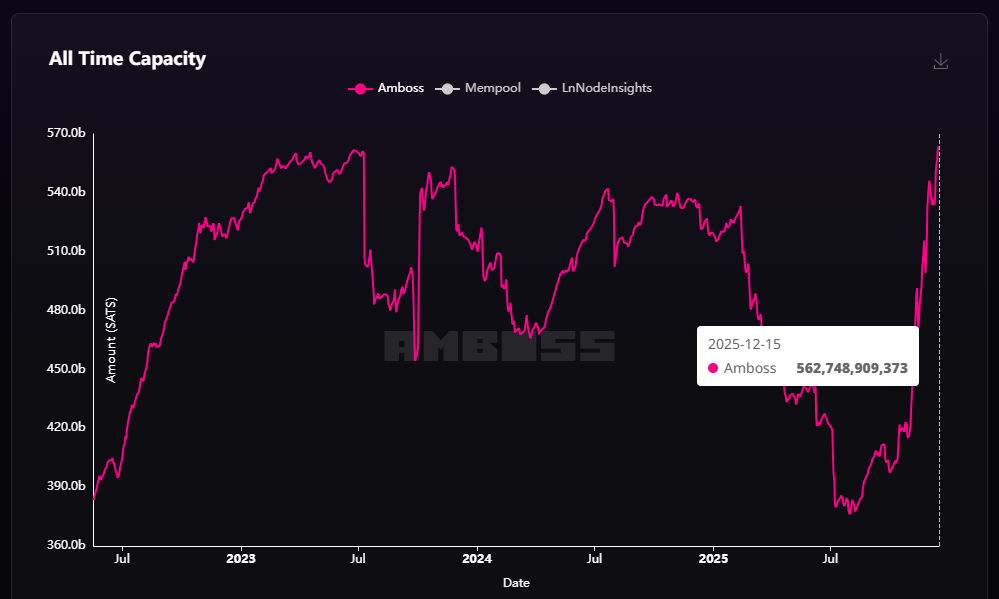 La capacidad de Lightning Network (LN), la red de segunda capa de Bitcoin, marcó un nuevo máximo histórico al alcanzar los casi 563.000 millones de satoshis, lo que equivale a más de 5.600 bitcoins (BTC) bloqueados en canales de pago.