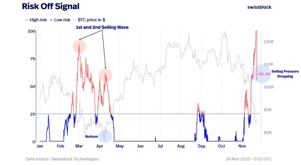 La firma Swissblock asegura que el activo digital «ha dado su primer paso real hacia la formación de un fondo». Ello, impulsado por una caída abrupta de la métrica Risk-Off Signal. Ese indicador mide el nivel de aversión al riesgo en el mercado de bitcoin.