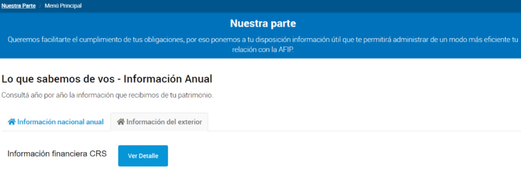 Incluso, en las últimas semanas, la agencia tributaria argentina ya muestra en el sitio web personal de cada contribuyente, en la sección “Nuestra Parte” (ver imagen), la información que posee sobre la persona, incluidas las cuentas bancarias en el exterior.