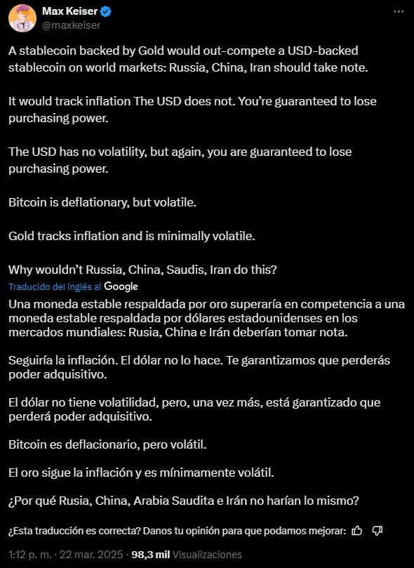 Max Keiser explica cómo una stablecoin respaldada por oro sería más confiable que las alternativas actuales. Fuente: @maxkeiser -X.