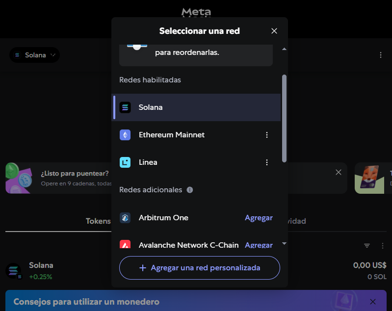 Interfaz MetaMask para "puentear" tokens entre Solana y redes EVM.