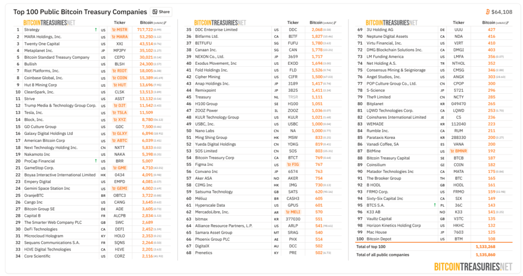 Recordemos que, tal como lo ha reportado CriptoNoticias, Strategy (anteriormente llamada MicroStrategy) ha hecho compras recurrentes de bitcoin desde 2020. Precisamente ayer, 23 de febrero de 2026, la empresa realizó su compra número 100. Strategy es la empresa de cotización pública con más bitcoin en su tesorería, tal como puede verse en la siguiente imagen: