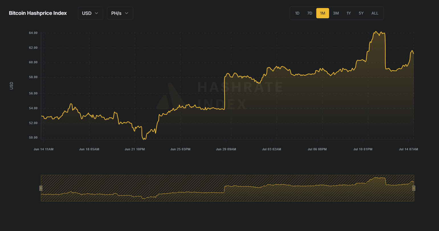 El hashprice se refiere al valor económico esperado de 1 TH/s de potencia de hash al día. Esta métrica cuantifica las ganancias que un minero puede esperar obtener de una cantidad específica de hashrate, según Luxor. Esto quiere decir que, en términos de dólares, todo minero que aporte 1 PH/s al día está generando cerca de 60 dólares.