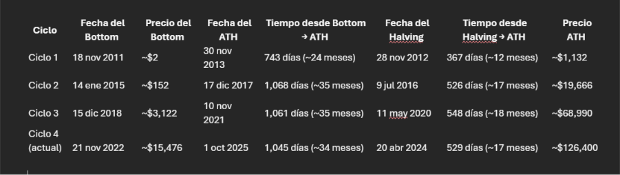 Bitcoin repitió el mismo ciclo que ha tenido siempre, con o sin BlackRock, con o sin Trump, con o sin Tesoreras. Como se muestra en el siguiente gráfico comparativo, la única diferencia es que la volatilidad cada vez es menor, pero se alcanzó el máximo histórico más o menos la misma cantidad de días después del halving que en ciclos anteriores. Y si se repite la historia, también podría creerse que el precio seguirá bajando, o lateralizando a la baja, en los próximos meses.