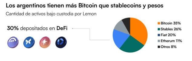 ¿Cómo se ve esto en Argentina? Para leer el fenómeno conviene separar tenencia de uso. Según datos de Lemon (un exchange de bitcoin y criptomonedas), la composición de cartera de los usuarios locales muestra más bitcoin (33%) que stablecoins (26%) y que pesos.