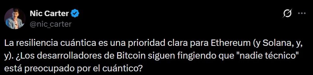 El especialista señaló que la resiliencia cuántica «es una prioridad clara para redes como Ethereum y Solana». Esto, en contraste con la actitud predominante en el entorno técnico de Bitcoin.