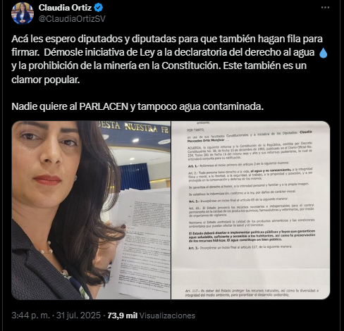 Mientras tanto, otros proyectos del gobierno, como la propuesta de revertir la prohibición de la minería metálica para explotar un supuesto yacimiento de oro, enfrentan oposición. La diputada Ortiz apunta directamente a la propuesta del presidente Bukele de explotar lo que él llama «un gigantesco tesoro bajo nuestros pies». Esto es un yacimiento que, según Bukele, podría contener hasta 50 millones de onzas de oro. Para lograrlo, el gobierno necesitaría revertir la ley de 2017 que prohíbe la minería metálica, una legislación aprobada precisamente por considerarla una grave amenaza ambiental y social.