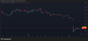 Como puede verse en la siguiente imagen, esta falta de flujo de capital también se vio reflejada en el precio de la acción del ETF. En el gráfico con velas de una hora se observa que el ETF permaneció «muerto» la mayor parte del día, es decir, que no hubo personas interesadas en la compraventa de este instrumento fiunanciero.