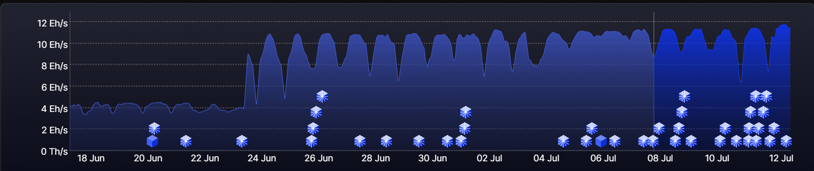 El 23 de junio, sin embargo su contribución saltó a más de 3 EH/s, un aumento significativo que catalizó la subida del poder de cómputo en OCEAN. Existen razones para pensar que ese minero podría ser Tether. Esta empresa anunció recientemente que empezó a aportar hash a este pool descentralizado de minería, como reportamos en abril del 2025.
