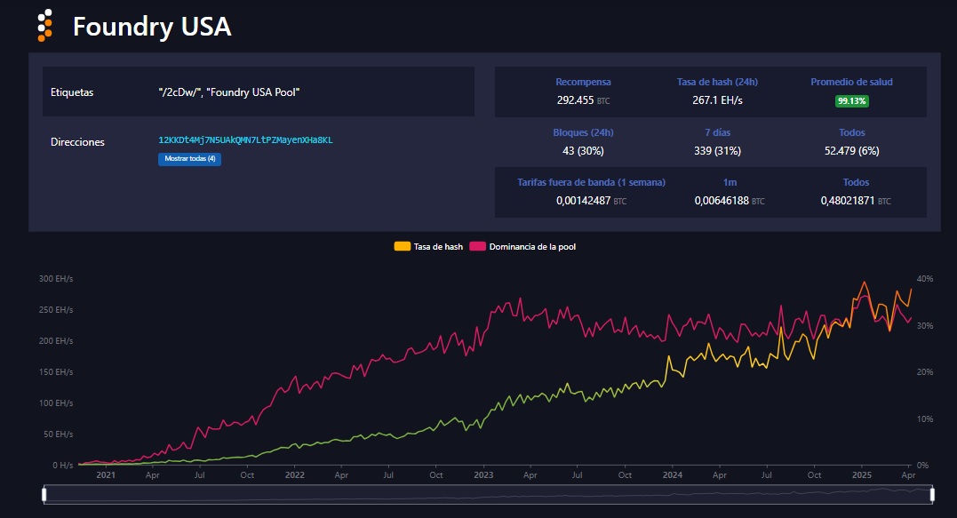 Foundry USA, fundada en octubre de 2020, se ha consolidado como uno de los pools de minería de Bitcoin más influyentes a nivel global, respaldado por Digital Currency Group (DCG), matriz de otras empresas como Grayscale. Su crecimiento ha sido notable, alcanzando la mayor participación en el hashrate total de la red de Bitcoin.