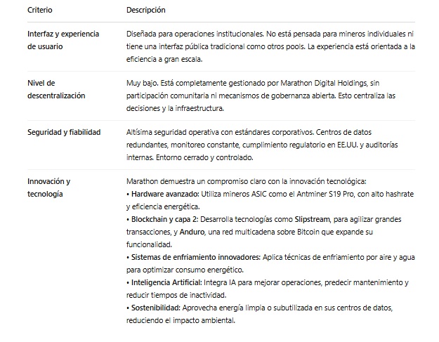 Su enfoque se centra en la computación despachable, asegurando la red de Bitcoin mientras optimiza el uso de energía limpia y subutilizada para un impacto más sostenible. Con una infraestructura altamente eficiente, Mara Pool ofrece una capacidad de hash significativa, respaldada por una de las mayores reservas de BTC en la industria.