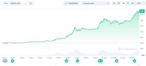 El buen rendimiento de los fondosimpulsó el precio de la cotización de la criptomoneda. Tal como se ve en el siguiente gráfico de TradingView, en la última semana aumentó más del 7,5%. Actualmente, su cotización es de 3.670 dólares.