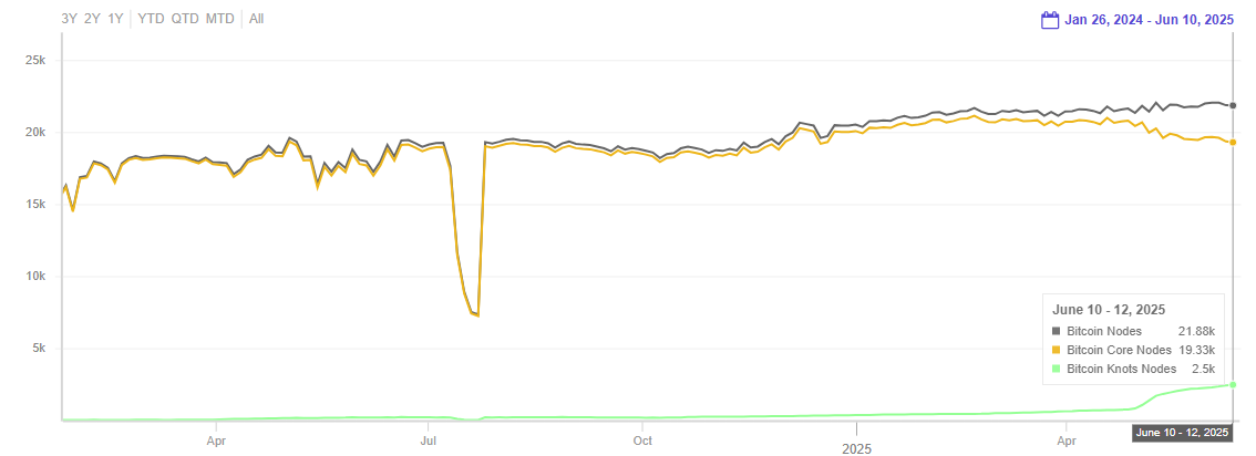 Esto implica que Knots representa más del 11% del total, una cifra histórica que refleja un crecimiento acelerado en su adopción, especialmente desde abril y principios de mayo de 2025, coincidiendo con una disminución en el número de nodos que ejecutan Core.