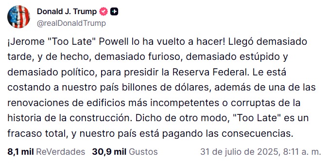 «Continuaremos definiendo la orientación adecuada de la política monetaria en función de los datos entrantes, la evolución de las perspectivas y el balance de riesgos. Contar con un banco central independiente ha sido un arreglo institucional que ha servido bien al público», expresó Powell en la conferencia de prensa del 30 de julio.