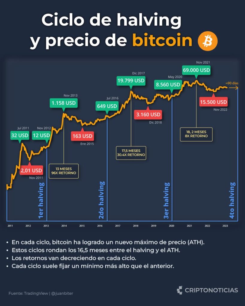 En Bitcoin, los eventos como el halving determinan los ciclos de mercado. Fuente: CriptoNoticias.