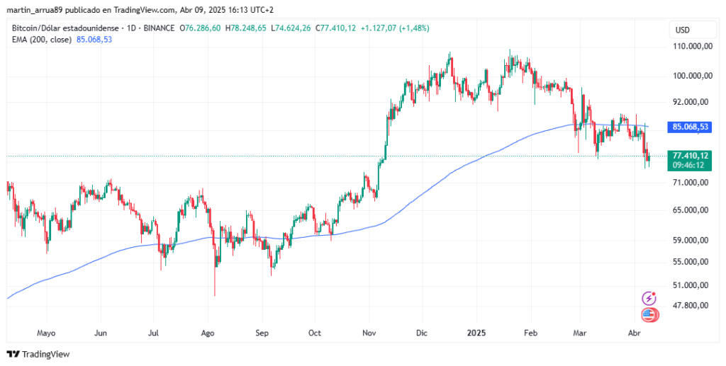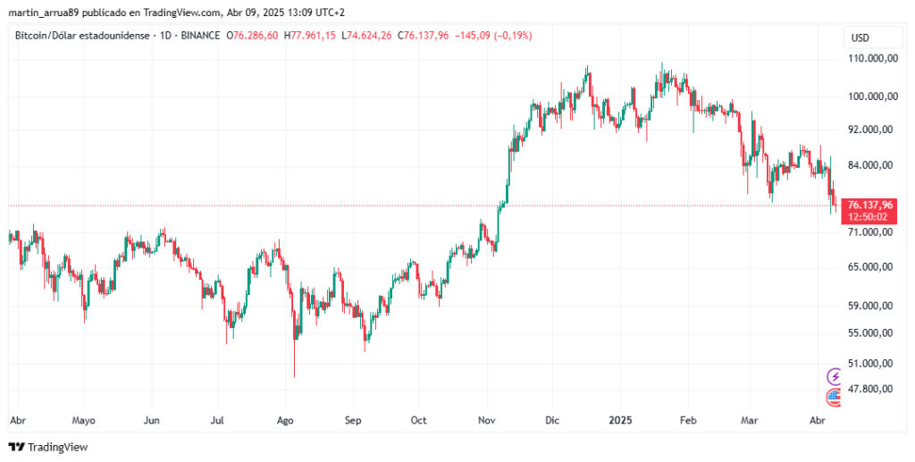 Como consecuencia de estas turbulencias económicas, el precio de BTC es de 76.100 dólares, un 30% por debajo de su máximo histórico (ATH) de 109.110 dólares, alcanzado el pasado 20 de enero.