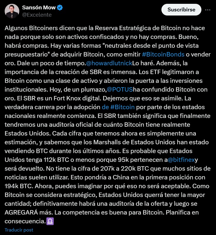 El desarrollador comienza su publicación dirigiéndose a quienes creen que la iniciativa no tendrá ningún impacto. «Algunos bitcoiners afirman que la reserva estratégica no logrará nada porque solo se trata de activos confiscados y no habrá compras», escribió Mow. Luego, recordó que existen formas «neutralmente presupuestarias» de adquirir BTC, como emitir bonos respaldados por bitcoin o vender oro. En este sentido, pidió paciencia con el proyecto y señaló que así lo hará Howard Lutnick, actual Secretario de Comercio de los Estados Unidos.