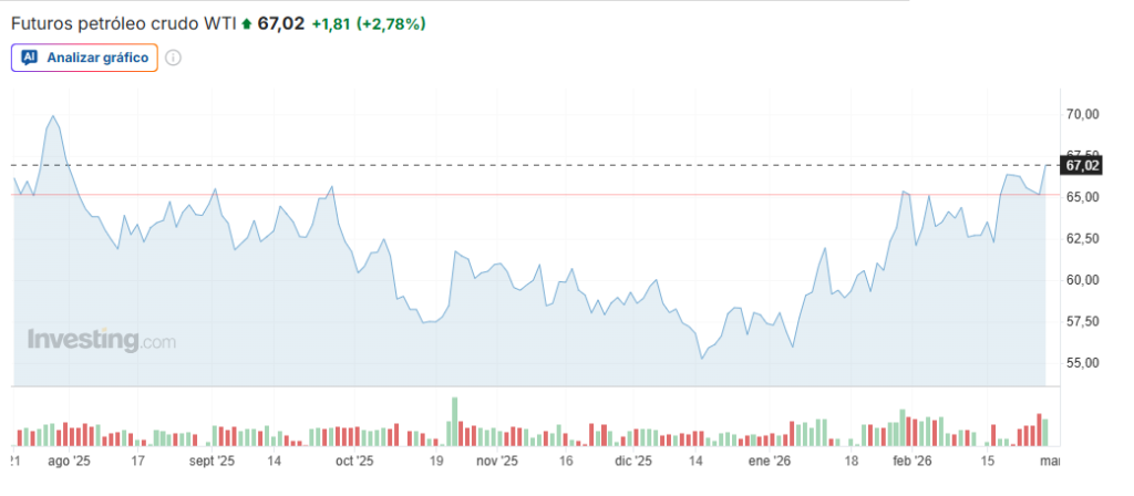 Como se observa en el siguiente gráfico de la plataforma Investing, los futuros de petróleo crudo cotizan a 67,02 dólares, un precio que no se veía desde julio de 2025.
