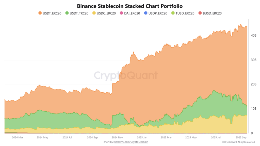 De acuerdo con un reporte basado en datos de la firma de análisis CryptoQuant, “el nivel récord de 45.000 millones de dólares subraya la posición de liquidez en stablecoins de Binance y señala un posible respaldo para la liquidez general del mercado y las entradas de capital”.