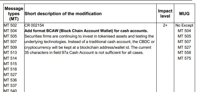 “Breve descripción de la modificación: añadir formato BCAW (Wallet de Cuenta de Blockchain”. Fuente: SWIFT.