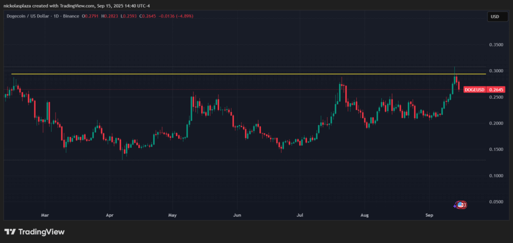 La llegada de este ETF al mercado, seguida de la aprobación de los ETF al contado podría impulsar el precio de DOGE. El siguiente gráfico muestra que el nivel de 0,29 dólares (línea amarilla) actúa como un techo impenetrable en al menos dos ocasiones este año: a finales de julio y el pasado fin de semana. El precio alcanzó esta zona y enfrentó una fuerte presión de venta que provocó correcciones significativas, lo que crea una resistencia histórica.