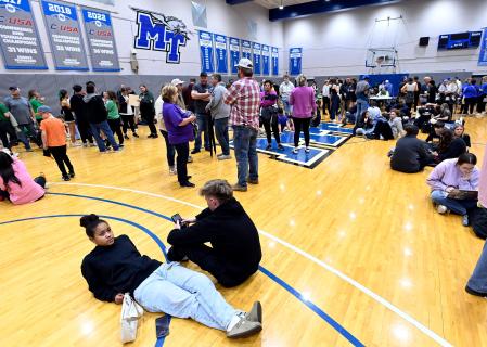 Personas refiugiadas en la Universidad Estatal de Middle Tennessee en Murfreesboro, Tennessee, tras la emisión de una alerta de tornado