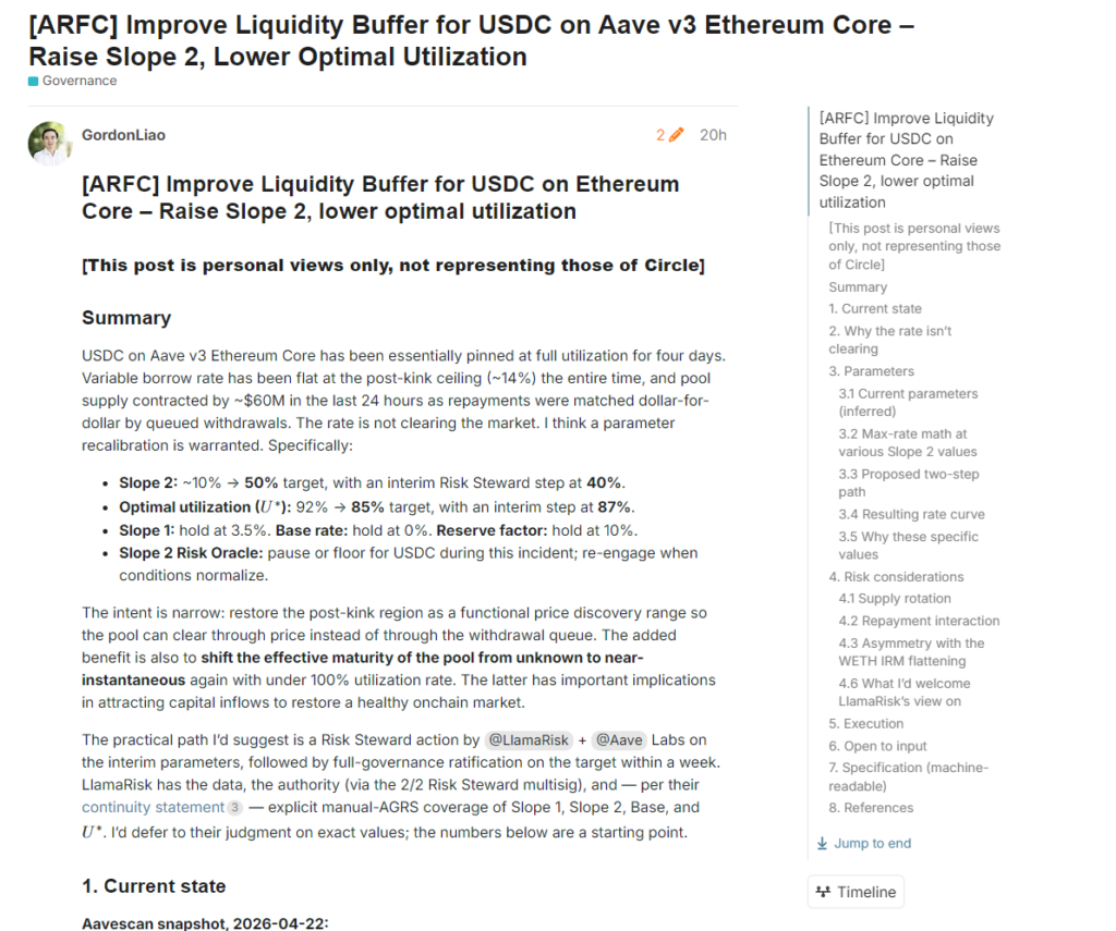 Circle presentó el 22 de abril una propuesta de emergencia en el foro de gobernanza de Aave para modificar los parámetros de tasas de interés del pool de USDC, paralizado desde hace cuatro días con una utilización del 99,87% y menos de USD 3 millones disponibles para retiros.