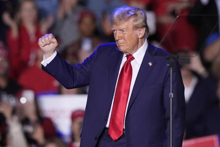 Republican presidential nominee former President Donald Trump gestures during a campaign event, Friday, Oct. 18, 2024, in Detroit. (AP Photo/Carlos Osorio)