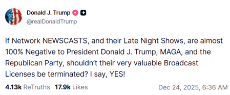 “Si los telediarios de las cadenas y sus programas nocturnos son casi cien por cien negativos con el presidente Donald J. Trump, MAGA y el Partido Republicano, ¿no deberían cancelarse sus valiosas licencias de retransmisión? ¡Yo digo que sí!”, ha escrito el jefe de la Casa Blanca en su cuenta de Truth Social.