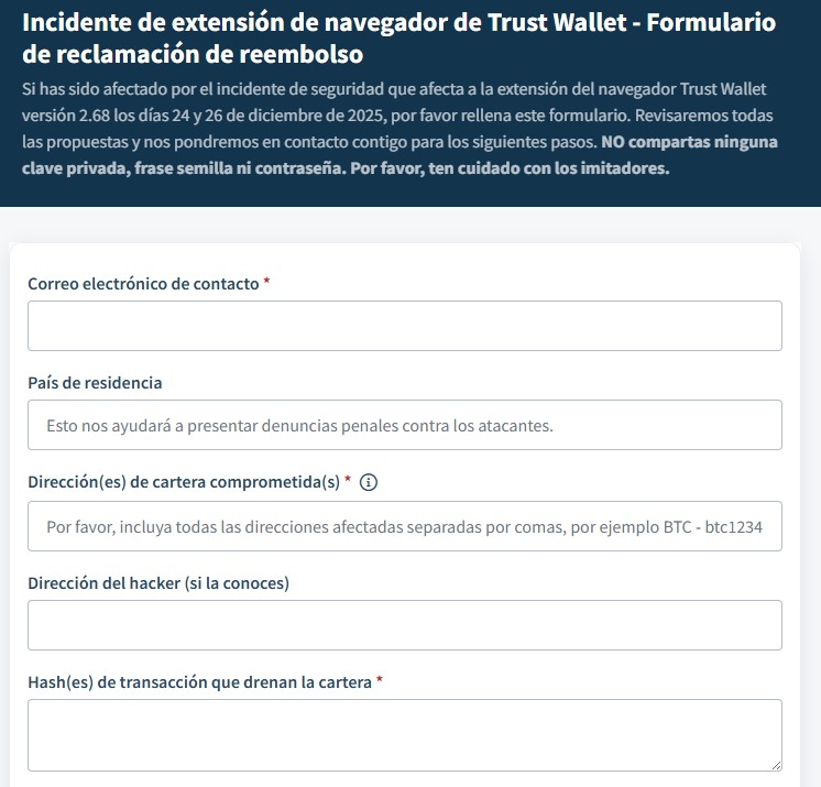 Los usuarios que hayan utilizado la versión afectada antes de las 11:00 UTC del 26 de diciembre pueden presentar sus solicitudes de compensación a través del portal oficial de soporte. Para completar el registro, el formulario exige brindar una dirección de correo electrónico, el país de residencia y detalles técnicos como las direcciones de los monederos comprometidos, los hashes de las transacciones y las direcciones de destino del atacante.