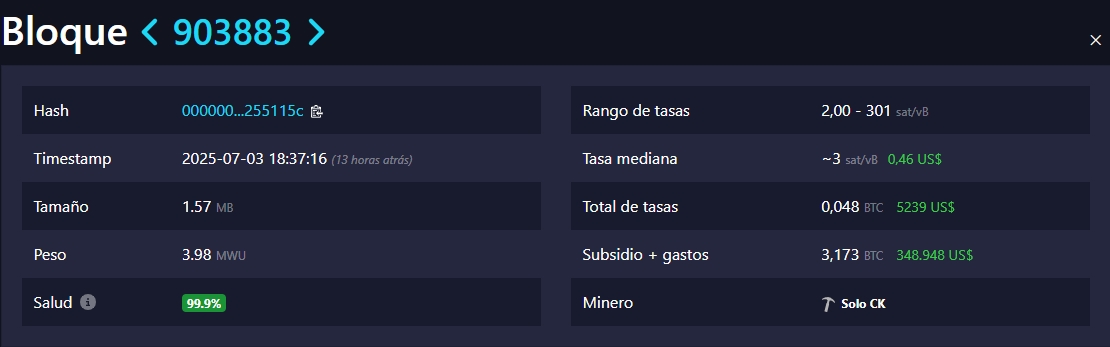 Un minero de la Unión Europea (UE) conectado a Solo CKpool, con un hashrate de 2,3 petahashes por segundo (PH/s), logró procesar el bloque 903883, obteniendo una recompensa cercana a los 350.000 dólares.