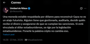 En el momento del envío, ocurrido este 22 de febrero, los tokens equivalían aproximadamente a USD 300.000. No obstante, tras el episodio, traders convirtieron el token en un fenómeno viral. El precio de la moneda se disparó desde los USD 0,008 hasta los USD 0,014, un aumento del 75%. Actualmente, cotiza en torno a USD 0,011.