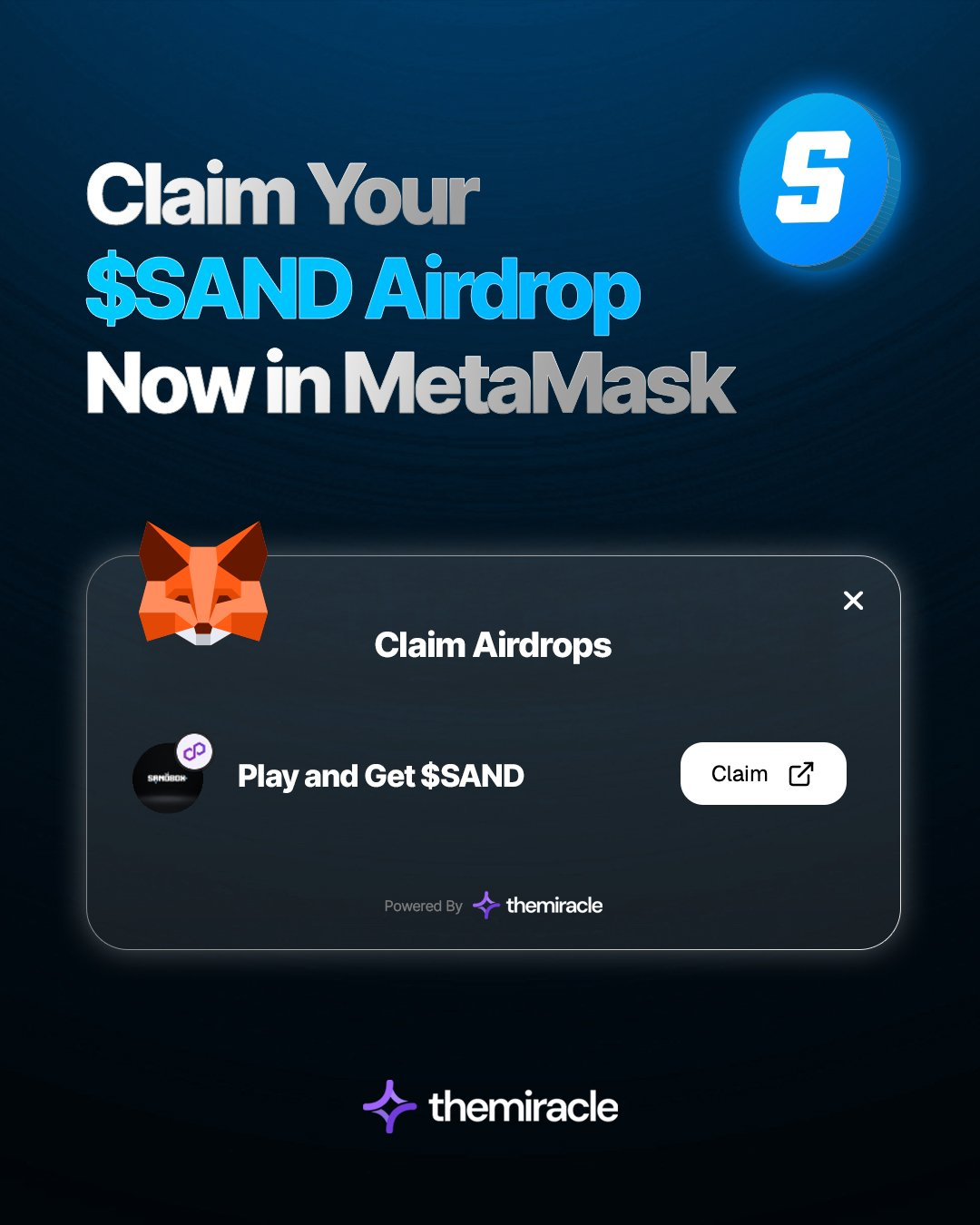«Reclama tu airdrop $SAND ahora en MetaMask». Fuente: Red social X, @themiracle_io